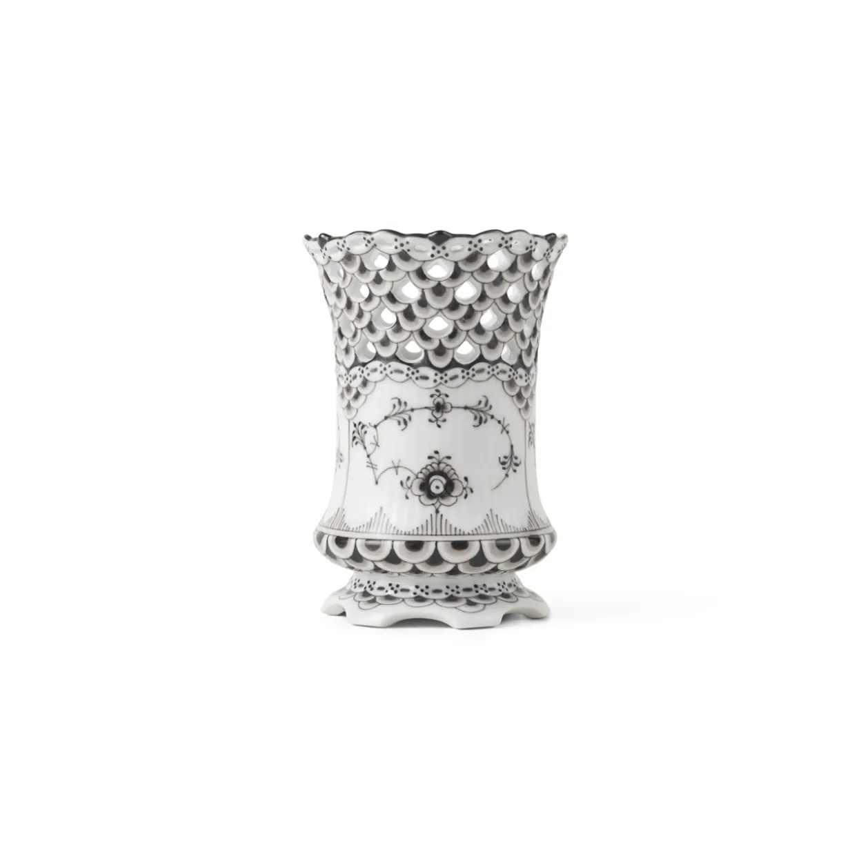 Representing the most subline of Royal Copenhagen craftsmanship, the smaller of two Black Fluted Full Lace vase exhibits a great level of detail in both modelling and hand-painting of the difficult black colour. A beautiful and versatile piece for the home or table, and a sure-to-be cherished gift for a special someone.
