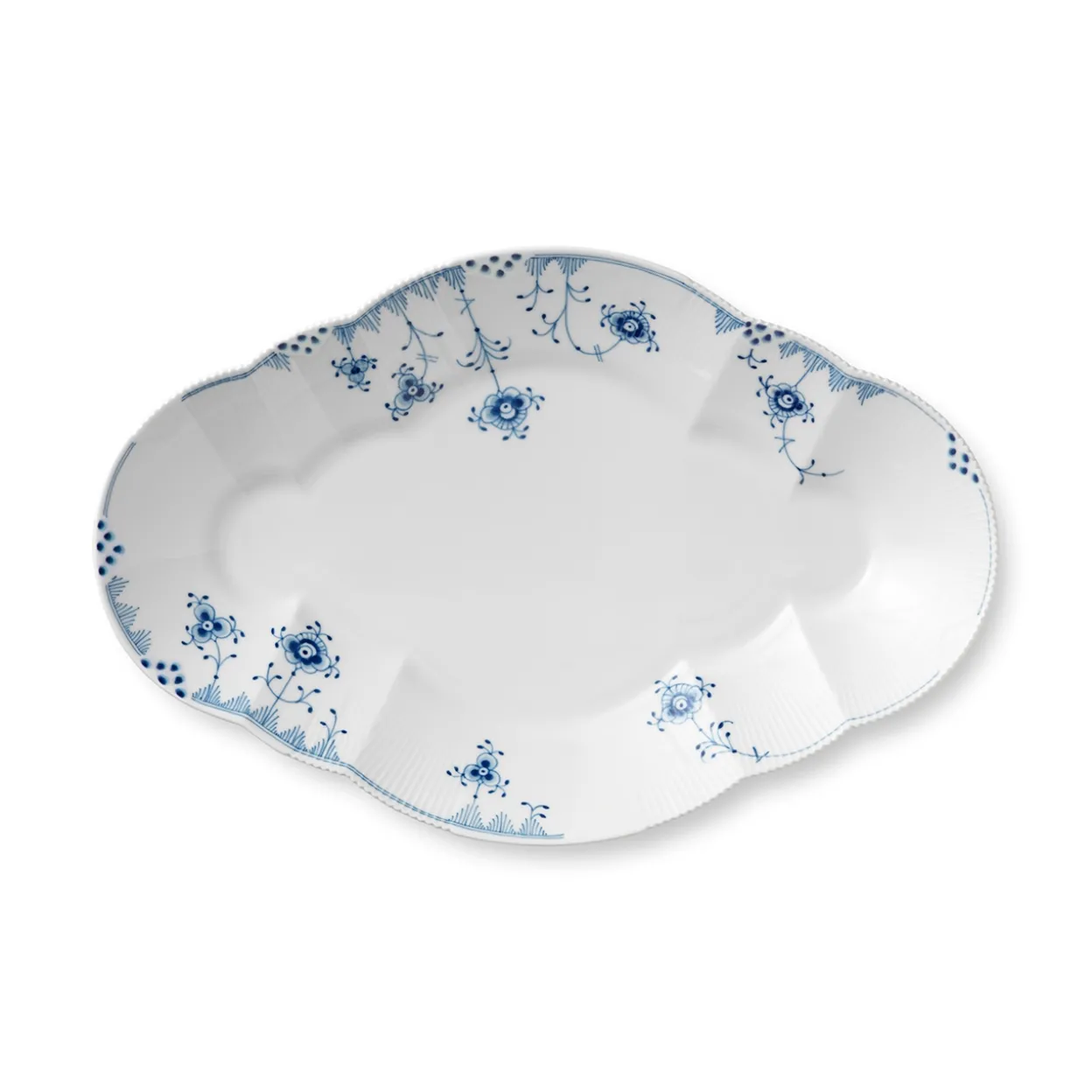 At first glance, the 38.5 cm Blue Elements Dish has a classic shape, but looking closer, the dish bursts in organic shapes that have been disassembled and reunited in a charming expression. The hand painted pattern of floral elements twirls around tactile flutes and the extravagant, jagged edge from Flora Danica in an unexpected combination of classic elements and a playful expression. The dish is ideal for all kinds of servings. The Blue Elements collection blooms in elegant joyfulness with an inspiring combination of classic Royal Copenhagen design elements and classic, hand painted decorations that grow freely across porcelain surfaces. Like White Elements and Multicoloured Elements, the collection shines on its own or in a combination with classic collections from Royal Copenhagen in a playful style of contemporary beauty.