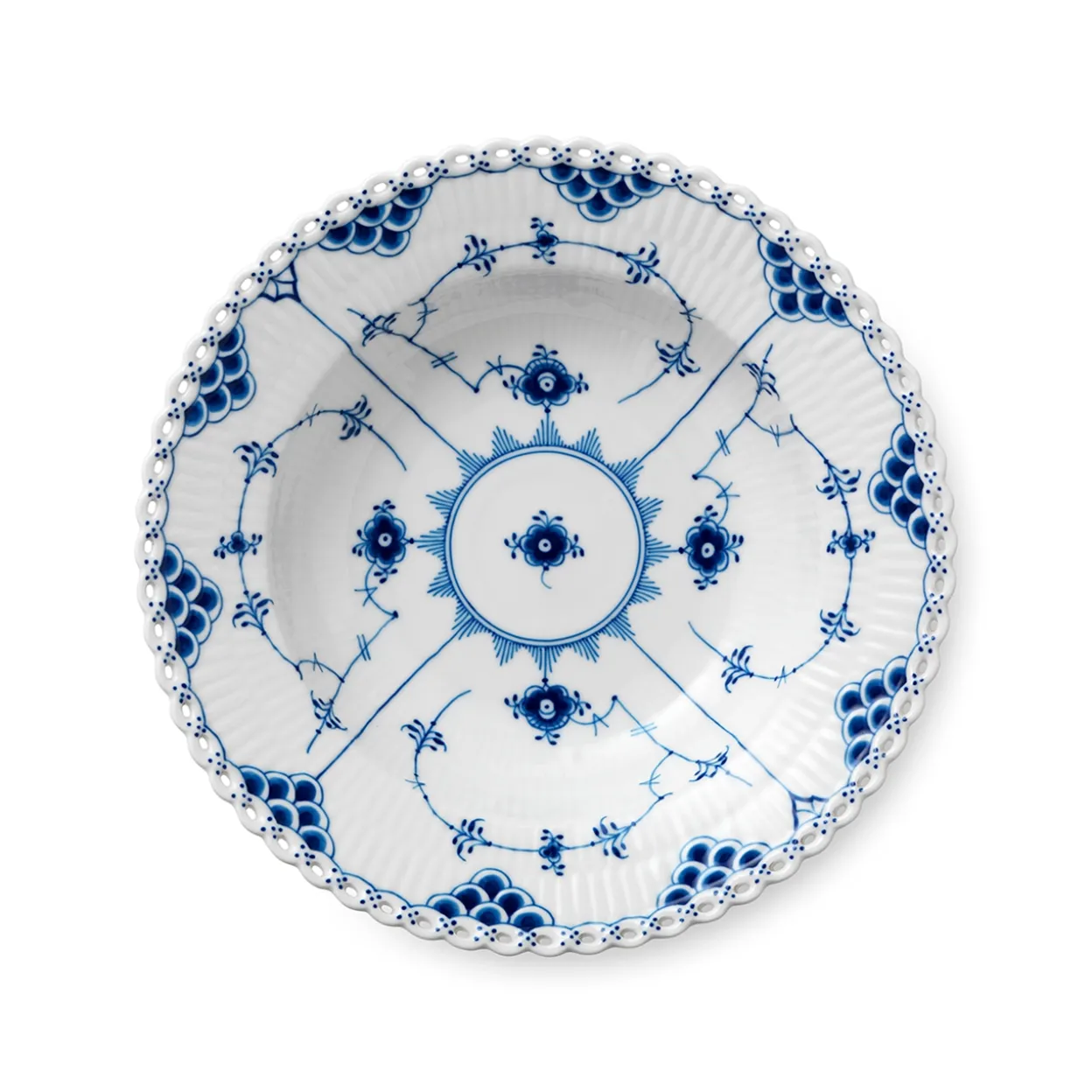 A wide rim with hand painted fish scale decorations is decorated with a hand pierced lace border framing this 23 cm Blue Fluted Full Lace Deep Plate. The fluted surface is adorned with classic, floral elements, creating a symmetry of elegance that will elevate any table setting. The deep plate is also perfect for use as a serving plate for cold and warm dishes. The epitome of porcelain craftsmanship, Blue Fluted Full Lace presents hand painted beauty at its absolute finest. The iconic, open-work lace border of the collection is carefully created, with each individual piercing in the lace delicately made by hand, and afterwards hand painted with the classic pattern of florals and fine lines. Elaborate with a passion.