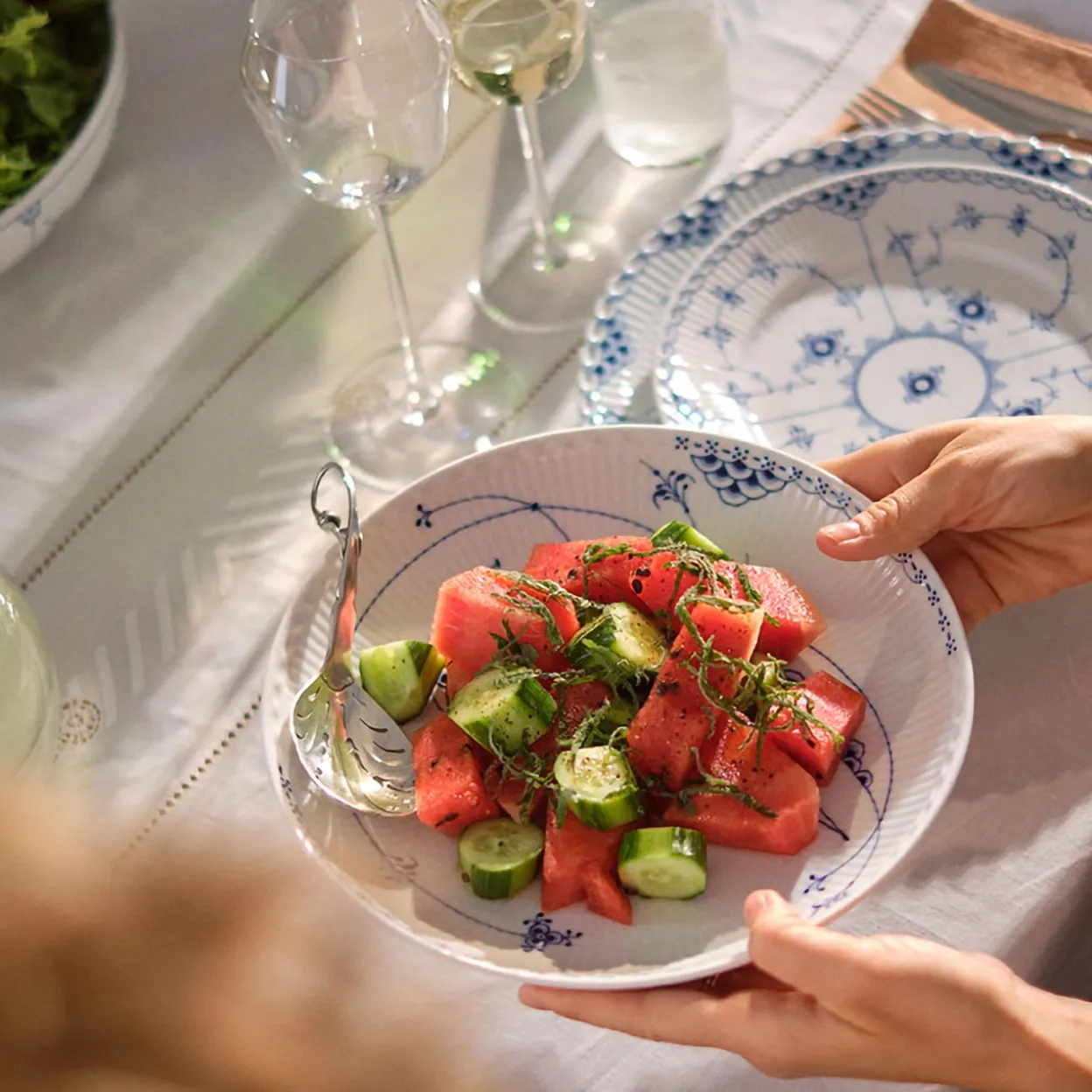 Use this beautiful, 27 cm Blue Fluted Full Lace Plate as a beautiful serving dish or a large dinner plate in a classic table setting. The plate from the Blue Fluted Full Lace Collection is hand painted with beautiful palmettos and stylized chrysanthemums, while a handmade lace adds the finishing touch of elegance. The epitome of porcelain craftsmanship, Blue Fluted Full Lace presents hand painted beauty at its absolute finest. The iconic, open-work lace border of the collection is carefully created, with each individual piercing in the lace delicately made by hand, and afterwards hand painted with the classic pattern of florals and fine lines. Elaborate with a passion.