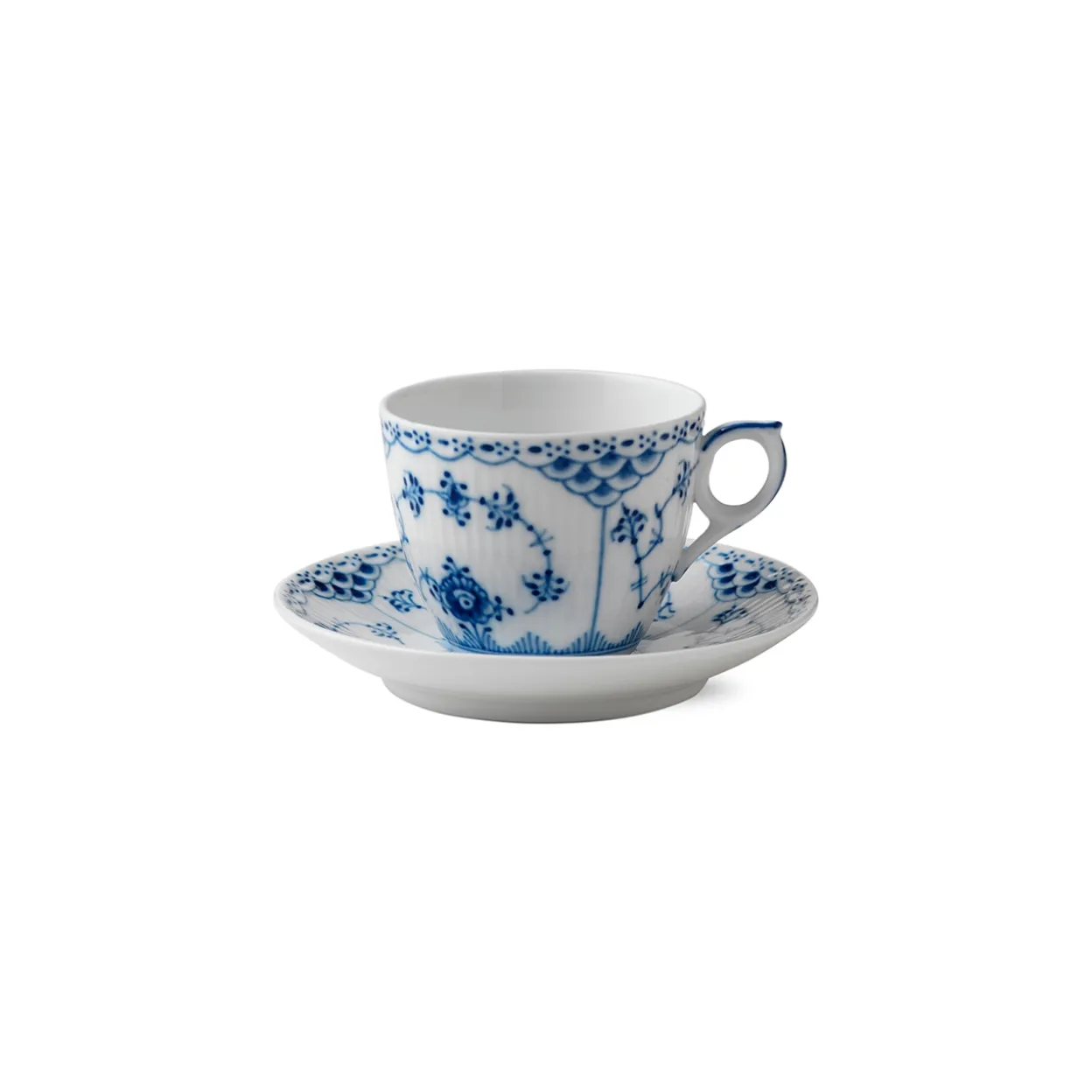 The classically shaped 17 cl Blue Fluted Half Lace Cup and Saucer is adorned with the beautiful half-laced rim and hand painted pattern of the collection with its floral elements of stylized palmettos and beautiful flowers, adding a graceful style to the coffee table. Blue Fluted Half Lace is adorned with delicate lace, elegantly framing the hand-painted motif and charming details of the collection such as snail shells on lids and handles. The collection is a beautiful and classic example of the Royal Copenhagen craftsmanship – it takes 1,197 brush strokes – no more, no less – to paint a Blue Fluted Half Lace dinner plate.