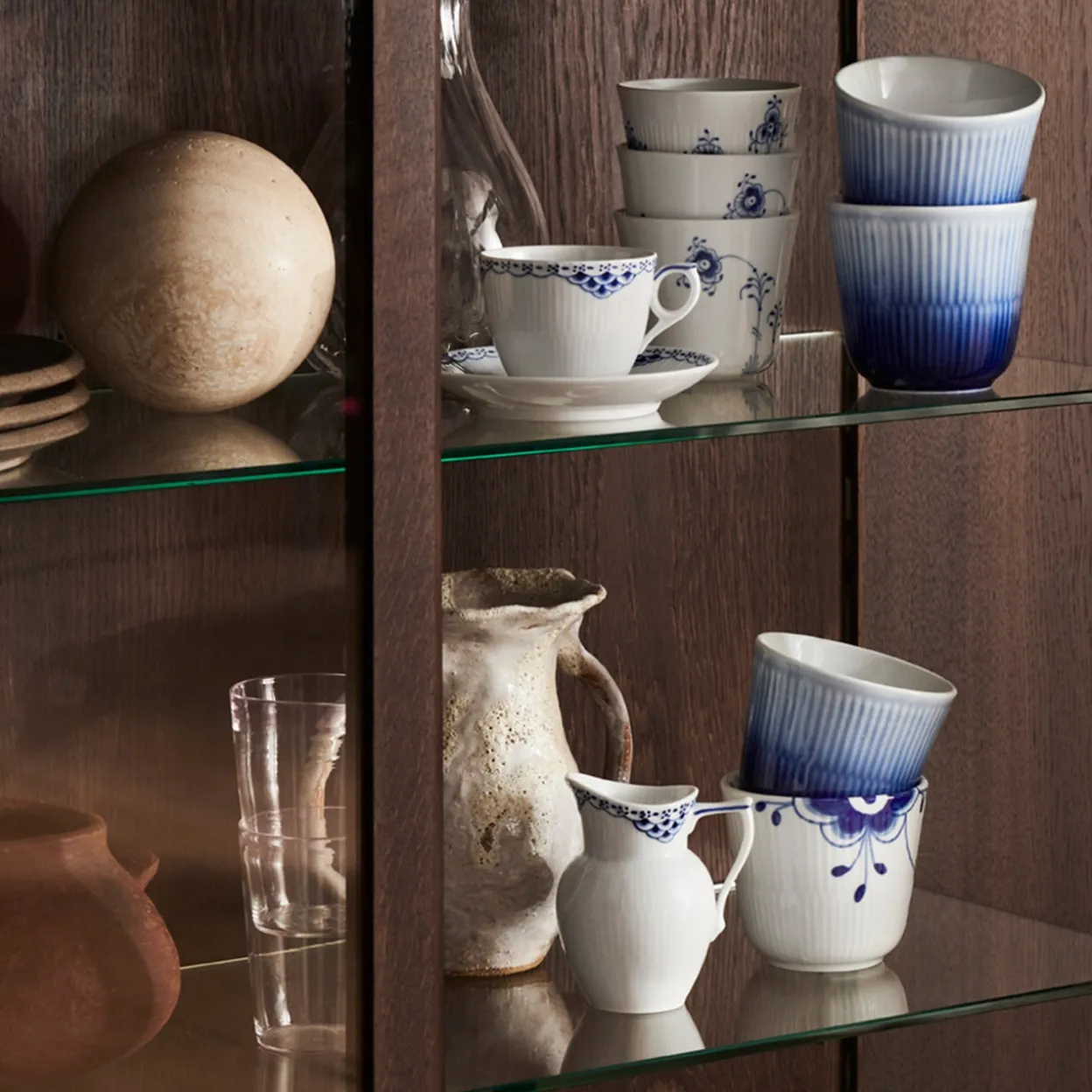 On this hand painted 26 cl Blue Fluted Mega Thermal Mug, a magnified palmetto grows from a blooming chrysanthemum in an eye-catching pattern. The mug’s inner and outer layer form a cavity, ensuring that the porcelain does not conduct heat. The mug is ideal both as a coffee mug and as a tea mug. Blue Fluted Mega is comfortingly familiar yet surprisingly refreshing. Born from a bold reinterpretation of the iconic pattern of Blue Fluted Plain, Blue Fluted Mega captivates with graphic and magnified sections of the original mussel painted pattern. Since its creation in 2000, Blue Fluted Mega has grown to become a true, new classic in Danish design. The eye-catching collection is beautiful on its own or in combination with other Royal Copenhagen dinner service.