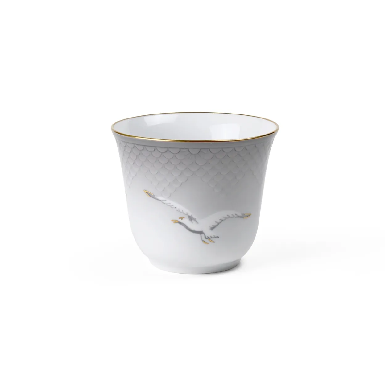 Originally introduced in a pale blue shade in 1893, the Seagull Collection was among Bing & Grøndahl’s most popular in Denmark. Now, the Thermal Mug has been dressed in a light shade of grey that beautifully compliments the golden details.